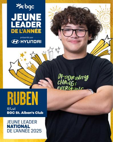 Ruben est un représentant exceptionnel du BGC St. Alban’s Club et de sa communauté de Weston-Mount Dennis à Toronto. Je suis extrêmement fier de lui et de tous les participants au programme Jeune leader de l’année. En tant qu’ambassadeurs et ambassadrices de BGC, ces jeunes contribuent à définir la prochaine génération par leur compassion, leur dévouement et leur dynamisme. Ils ont déjà un impact considérable dans leurs communautés et leurs Clubs, et j’ai hâte de voir comment ils continueront de croître et de s’épanouir.